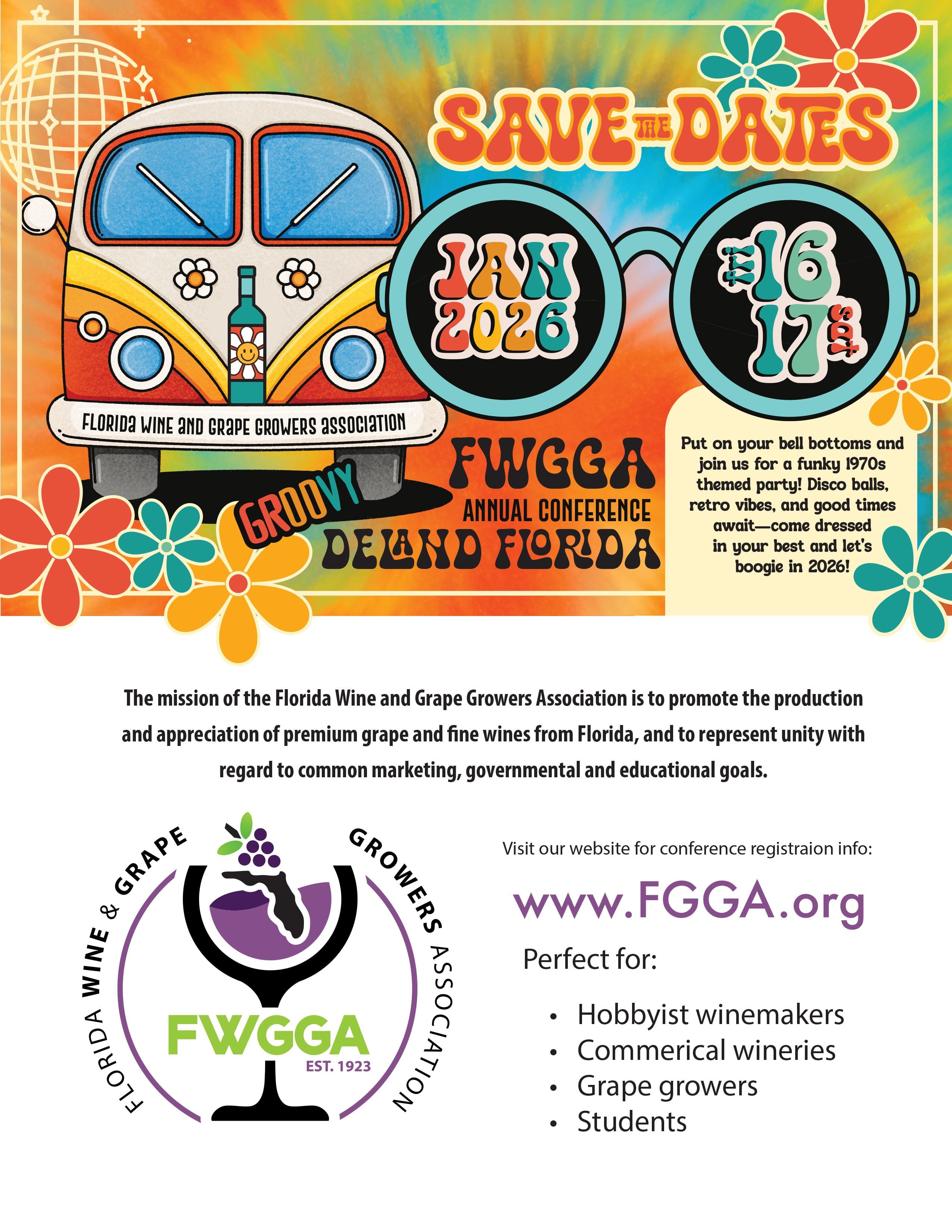 Get ready to step back in time and groove into the future of Florida wine! The Florida Wine and Grape Growers Association invites you to Deland, Florida, January 16–17, 2026 for a one-of-a-kind conference inspired by the funky vibes of the 1970s.